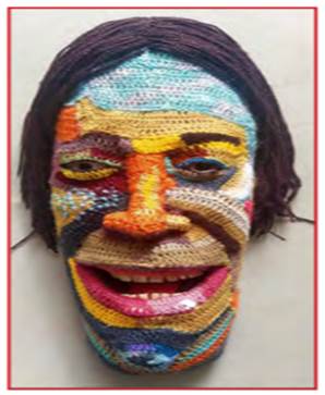 Born Jorhat, Assam in the year 1971, Archana Rajguru Biswas is another remarkable name of contemporary woman artists in India who studied bachelor’s degree in Painting at Kala Bhavana, Santiniketan and did postgraduate in Graphic Arts at Faculty of Fine Arts, M. S. University of Baroda. After that she taught in various places as a senior faculty at NID, Ahmedabad. She has also worked as an animator with some prestigious animation studios of Hyderabad. Presently Archana lives and works in Hyderabad. In her early works of tempera painting and lithography, sad, intense melancholic human protagonists in monochrome were predominantly dominant in the pictorial space. But her recent partially three-dimensional works has been done in a surprisingly, new, innovative way working mostly with yarns as her medium. Being a complex person, she used to stitch complex pattern on pieces of clothes, creating semi abstract and extremely expressive and expressionistic images with plain running stitches. Her recent works are however of a completely different and unique genre by themselves- masks made with the crochet needle and yarn as her protagonist image Figure 9 As curator Chandrma Bhattacharyya writes, Archana current works in the show entitled 14- Kaleidoscope of Different Realities at Janus Art Gallery, Kolkata are not just completely had crafted , but in a medium that is traditionally considered feminine. Her works largely with yarns, handling of the yarn in different manners excites her aesthetic senses, which itself sets her apart as a creative person.” Figure 9