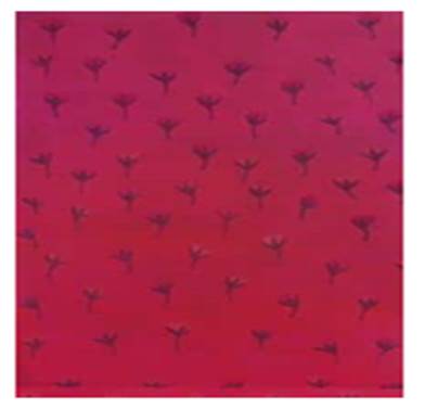 As an abstract artist, Santana Gohain’s earlier works reflect the fascination she developed for the industrial surroundings of her then, studio. Through intensive observation and sensuous absorption of the nature of these hard materials and heavy industrial processes, she developed paintings, which were dark, leaden, black or charcoal grey, tinged with rust coloured smears Figure 12 These works are large, six feet high and four feet wide, with thick sides like great, monolithic slabs of heavy metal and when lined up in the gallery, they emanate a sense of implacable presence. The recent new paintings we are now considering, reflect a very different environment, a significantly softer textural world, but one equally dense and dynamic. The artist has mentioned how significant the colour red seemed to her in childhood paintings, growing up in Assam. She lived in a beautiful and constantly changing landscape, with vibrant colours of flowers like Simuli and Palash in bloom, and sunsets on the river Brahmaputra, glowing with orange and magenta. She was also aware of the red colour prevalent in the weaving and printed patterns of traditional dress, especially during festivals. Another painting which again contains approximately three hundred flower motifs, this time, of roses, comes alive in dim light Figure 13 Each rose flower and stem, faintly delineated, is a uniquely drawn variation of the motif, in the colours of rosewood and each, has a kind of waxy sheen. Eminent British sculptor Peter Bevan termed Santana’s work as Invisible movement and write, “Rows of dark paintings lined the walls and it was only as I walked towards these and began to look into them, that I discovered they were coming alive.” Figure 13