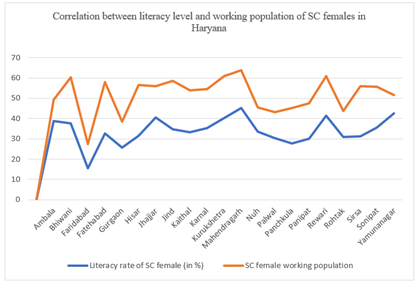 between two variables, i.e. Literacy rate and Working population of SC Women