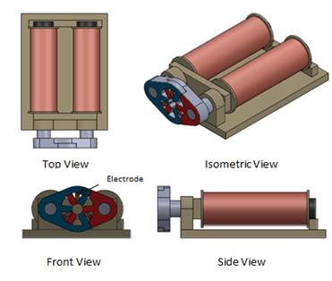 A DC motor rotates the specimen between the magnetic poles. For the ECM, electrodes exist in the gap between the two magnetic poles, as shown in Figure 2. A separate DC supply has been provided and one end is connected with the electrode and the other is with the work piece and the electrolytic solution is flows in between the cavity of work piece and the electrode to complete the electrochemical process. Due to the chemical reaction the oxidation layer was formed on the surface of the specimen which the abrasive particles may remove with ease. The actual picture of the setup is shown in figure 3. Figure 2