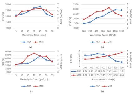 4. RESULTS AND DISCUSSION This segment provides an explanation of the results acquired from the preliminary experimentation. The experimentation was conceded out at a fixed workpiece speed of 600 rpm with an electrolytic concentration of 15 g/L, a 15% abrasive weight, and abrasive powder of 400 mesh size. Figure 4(a) depicts the effect of machining time. The figure shows that as machining time increases, the PISF gradually increases to 18.30% at 45 minutes, after which it decreases. This could be due to the increased time for the flexible brush to encounter the workpiece, resulting in improved PISF. Additionally, an increase in machining time initially leads to an increase in MRR, up to 5.86 mg/min with a machining time of 45 minutes, followed by a slight decrement. Figure 4