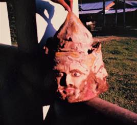 etu Manushya Rupa (As seeing strange entity of Lord Vishnu in the guise of Naraasimha Demon king Hiranyakashipur became silent, neither lion nor human being….).”. (Mahanta 2011, p.16) The method of mask making in Assam is very old, though it is complex in execution. First, a star-form lattice or Lakhimi Sutra as similar to traditional bamboo basketry of finely stripped bamboo has been developed to a skeletal framework of whole mask. (Goswami 2016, p.12) After weaving the inner skeleton with bamboo strips then mask is covered with mud lapped cloth and after drying a mixture of cow dung of calf and sticky soil is applied on the cloth-covered mask to give the proper shape of a character. After drying the mask is again covered with another layer of mud lapped cloth and kept in the sunshine to dry. Then masks are given shape using locally available earth, vegetable, and mineral colours source from Hengul or red, Haitaal / yellow, Dhalmati/ white, blue from indigo plant, black from ashes of dried vegetable gourd or smoke of earthen lamp. Hair of mask characters is made of jute. Figure 1