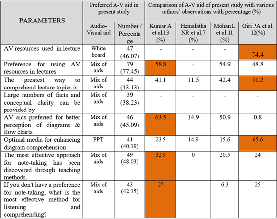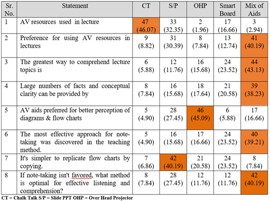 The viewpoint of learners regarding diverse active teaching methods indicated that the utilization of audio-visual materials is the most favored approach. Research conducted by Garg A et al. found that students express a desire for teachers to incorporate audio-visual aids into their lectures. However, it remains uncertain whether this inclusion actually improves their comprehension or enhances their performance in examinations. The present study demonstrates that a significant proportion of learners prefer a combination of aids. A notable 77.45% of students indicated a preference for incorporating a blend of audio-visual resources during lectures. This aligns with the findings of previous studies conducted by Kumar et al. (2013) and Mohan et al. (2010) and Garg A et al.3, who similarly reported results of 58.8%, 54.9% and 48.8% respectively, to the present study. Learners predominantly perceive audio-visual aids as pivotal for effective lecture delivery and suggest adapting these aids based on subject matter and topic. Prior research implies that the most comprehensive understanding of subjects is achieved through a fusion of AV aids. This parallels the findings in the current study, which highlight the benefits of utilizing a mix of aids. 6.7 At times, learners favored Chalk Talk (CT) due to its potential to foster interaction between educators and students. In the current research, a significant number of students expressed the view that emphasizing essential points could be achieved through the use of a CT (Chalk-Talk) whiteboard. This finding aligns with the outcomes of Hemalatha's study3. A significant majority (87.25%) of respondents expressed a preference for auditory input accompanied by visual aids, along with note-taking to encourage subsequent reading. Nonetheless, both male and female learners predominantly favored a combination of aids for note-taking during classes. Mohan L et al.6 noted that students favored PowerPoint as the most effective approach for improving diagram understanding. In the current investigation, the chosen medium for enhancing diagram perception was overhead projection 46 (45.09%). The CT (Chalk / Talk) was discovered to be the least favored medium, with only 5 (4.90) of respondents expressing a preference for it. In research carried out by Hemalatha NR et al 5, Mohan L et al6, Giri PA et al3, and Kumar A et al7, it was consistently observed that students showed a clear preference for using audio-visual aids, particularly PowerPoint presentations (PPT), which had the highest percentage. Similarly, in the present study, students had a stronger perception of flow charts and found them easier to reproduce when using Mix aids (45.09%). The majority of students (75.49%) opt for a combination of listening to lectures with the assistance of visual aids and taking notes, which serves as a catalyst for encouraging additional reading. Variations were observed in the attitudes toward comprehending and grasping a specific subject. Female students exhibited a preference for Listening with visual aids and the practice of note-taking during lectures. A majority of students (48.03%) favored a combination of aids for enhancing their listening and comprehension skills, even if they were not inclined to take traditional class notes. The majority of both male and female respondents showed a preference for using a combination of aids when taking notes in their classes. In the current investigation, it was observed that a higher percentage of female students (65.68%) exhibited a preference for taking notes during lecture classes, whereas this preference was slightly lower among male students (21.56%) It was notable that a majority of both male and female respondents preferred using a combination of aids when taking notes in their classes. The full advantage of visual aids is realized when they are integrated into a well-organized lecture. Both visually and verbally delivered lecture content has demonstrated that visual information surpasses verbal information in terms of both immediate and lasting retention. Achieving the utmost advantage from audio-visual aids requires their optimal utilization. 10. CONCLUSION The perspective of students regarding the integration of audio-visual materials within lecture sessions holds crucial importance in shaping contemporary education. While the advantages of utilizing these resources are apparent in terms of improved comprehension, engagement, and accommodating various learning preferences, there are also challenges associated with technical issues, accessibility, and maintaining an interactive learning environment. By effectively addressing these challenges and harnessing the benefits of audio-visual tools thoughtfully, educators can establish an enriched learning atmosphere that optimizes student understanding and memory retention. As technology continues to evolve, students' viewpoints on audio-visual resources are likely to play an increasingly pivotal role in influencing effective and innovative teaching methodologies. The current study revealed that lectures delivered using a combination of audio-visual aids were better received by students. These findings provide valuable insights into students' perceptions, aiding in the identification of their expectations and needs. 11. RECOMMENDATIONS · Based on the findings of this study, the following recommendations are put forth: · Teachers should consider the students' opinions when it comes to understanding the use of visual aids. ·