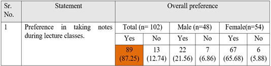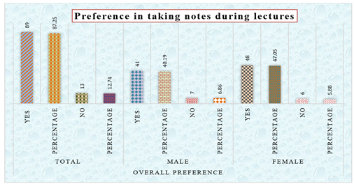 9. DISCUSSION The current study revealed that the majority of the learners favored taking notes during the lecture. The table above shows that 89.25 learners preferred taking notes during the lecture, while 12.74 learners were not in favor of it. Figure 4