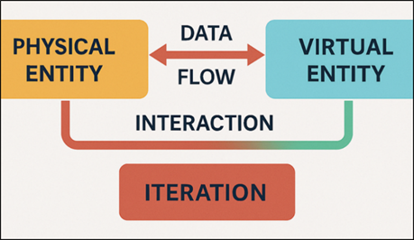 Figure 1 Interactive Relationship Between Physical and Virtual Entities in Creative Production Together, this combination gives way to a new creative existence with digital intelligence and physical experience coexisting. In theoretical terms, the meeting between the virtual and the real world transforms creative production into a learning, changing, growing live system. Since this is the case, the Digital Twin is not only an inactive model, but it becomes a co-creative being that links the artistic vision with the technical accuracy. 3) Framework