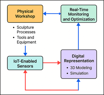 1. INTRODUCTION Digital Twin (DT) technology has transformed the conventional industrial design, engineering, and manufacturing in the past few years. DT technology allows users to connect, monitor and optimize systems in real time. It is based on the concept of creating a dynamic data-driven digital replica of a physical system. The first Digital Twins were applied in the high-tech sectors such as aircraft, automobiles, and urban infrastructure. However, they also have a lot of potential in a lot of other areas as well. In a digital economy, the combination of art and digital technology is transforming the way we create art, safeguard our cultural heritage and operate workshops. Digital twin systems will also bring a lot of advantages to sculpture workshops which have always been famous for using complex materials, trained labour, and small iterations over and over again. Traditional forms of art require a high degree of accuracy with the use of hands and playing with various materials. Such a workshop is difficult to manage in terms of determining how to use the available resources, monitoring the process and ensuring that the artistic intent is maintained Ceccotti (2022). Inconsistent creative outputs, inefficiency and loss can result from the lack of proper record-keeping and real-time monitoring. Also, in an increasingly concerned world with sustainable art production and digital preservation of cultural history, there is a pressing need to rethink workshop management without breaking the validity of artistic expression. Digital twins are a revolution for modelling, visualising and improving each step of the sculpture-making process. This is made possible through a combination of the Internet of Things (IoT) and data analytics. When we talk about digital sculpting, we usually talk about the process of creating a virtual copy of the actual workshop, with tools, materials and even the sculptures themselves. Instruments and machines may be equipped with sensors which can give real-time measurements of performance, temperature, sound or tool wear Rauschnabel et al. (2022). This enables the virtual model to be as accurate as possible with how things are today - 3D scanning and modeling technologies can capture the shape and change of statues as they are built at different stages. Combining these data streams what is created is a two-way digital environment where artists, techs and managers can keep an eye on operations, guess when repair will be needed and to look at creativities process with a level of accuracy that has never been seen before Theodoropoulos and Antoniou (2022). This is another important aspect of the use of DT methods within art classes, as it can be used to help people from different subject areas work together. Artists can experiment with ideas using virtual versions, managers can maintain a record of creative decisions and engineers can look into issues with the comfort or materials. By better utilizing materials and using less energy, this digital change also promotes the use of environmentally friendly habits. So, sculpture workshops are not only places where art is created, but are intelligent spaces where they are flexible, adaptable and learning from data at all times. 2. Literature Review 1) Overview