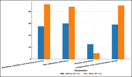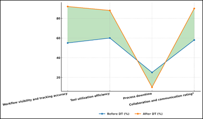 This has demonstrated that real-time monitoring and digital synchronisation made operations much more clear. Figure 2 illustrates the way digital transformation enhances the core measures of operations. The effectiveness of using tools also went up from 60% to 88%, that shows that data-driven insights and prediction analytics helped to make better use of resources. The fact that process downtime went down from 25% to 10% proves to be how DTs reduce problems by finding equipment or routine problems very early on.