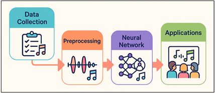 Figure 1 Multistage Architecture of AI-Powered Beat Detection and Its Educational Applications This helps students to understand how rhythm and maths have a correlation and how to put things into order of time. Figure 1 illustrates the data flow from data collection to educational applications based on artificial intelligence. Students of computer science, cognitive psychology or artificial intelligence can also use beat detection systems as case studies to learn about signal processing, brain structures and how people and computers communicate Kucak et al. (2018). That way, it's not only a teaching tool, but it's also a means to bridge the arts education with STEM education. The emergence of online learning and interesting digital places worldwide makes AI-powered beat recognition even more handy. Intelligent systems with the ability to assess and advise students independently are very relevant in remote environments where conventional feedback loops between teachers and students are not readily available. They allow students to practise alone without forfeiting useful comments based on data Hamim et al. (2021). Beat recognition also facilitates collaboration between people, enabling students to experiment with a rhythm-based form of composition publicly in a platform. Despite these advantages, it is not easy to implement AI beat recognition in education. 2. Background and Literature Review 2.1. Evolution of Beat Detection Techniques The evolution of beat recognition techniques reflects a constant change from the basic analysis of the signal to intelligent, flexible systems to comprehend difficult rhythmic structures. In the 1980s and 1990s, the first methods largely relied on signal processing techniques based on the tracking of amplitude envelopes, spectral flux measurement and onsets. These methods discovered fast changes in the energy of audio data and associated them with potential beats Bozak and Aybek (2020). Even though they were pretty good at what they did, they often had trouble with changing tempos, irregular rhythms, and multiple sounds which meant they were only good at simple or monophonic pieces. With computers and digital music, more and more frequency-domain techniques were published, becoming increasingly sophisticated as computers got faster. These relied on Fast Fourier Transform (FFT) and wavelet analysis to be able to better pick up rhythmical cues across a wider range of frequencies. By the use of timing estimations and flexible filtering, these methods made things more stable Rebai et al. (2019). But they still relied on features and rules that were created by hand and were therefore difficult to let them be used in a wide range of musical styles. In the 2000s, statistic algorithms of machine learning such as Support Vector Machine (SVMs) and Hidden Markov Models (HMMs) were introduced to describe rhythmic patterns in a statistical manner. This was a turning point. 2.2. Role of Machine Learning in Audio Signal Processing Audio signal processing has been transformed completely by the use of machine learning (ML) that allows systems to extract, analyse and create sound features with a level of accuracy that was previously never observed. In the past, digital signal processing (DSP) jobs such as finding beats, guessing pitches and categorising genres of music depended on rules written by hand. Even though they worked well in controlled settings, they weren't able to handle complex voice data from real life Costa-Mendes et al. (2021). Machine learning developed an adaptive framework in which models have the ability to learn patterns and structures from large datasets that have been labelled which reduces the need for human feature engineering. ML algorithms, especially deep learning model, look at raw waveforms or spectral representations in order to find important links between time and harmony in the audio processing Aslam et al. (2021). Convolutional Neural Networks (CNNs) are very good at learning spatial and spectral properties from spectrograms which allows them to quickly spot patterns such as beat or sound. On the other hand, Recurrent Neural Networks (RNN) and its variants, such as Long Short-Term Memory (LSTM) networks, are very good at modeling the dependency between events in a sequential fashion. They're capable of recording the way that the speech and music data flow in time. ML can be used in a lot of different areas of audio, from source separation to real-time audio composition, automatic song recording to speech recognition and mood detection Martínez-Abad (2019). Some of the key studies, techniques, accuracy, and effects in education are summarized in Table 1 By learning generalisable rhythmic models, ML helps to make beat recognition more immune to noise, changes in speed and different kind of music. Table 1