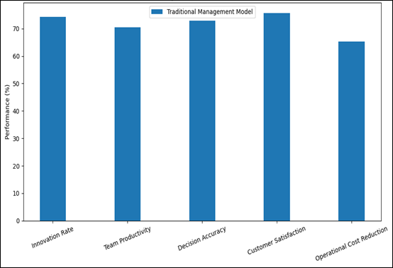 The Figure 2 shows the performance distribution of the traditional model of management in five main parameters. It demonstrates neutral effectiveness in innovation, accuracy of decision, and customer satisfaction with the scores being of between 65 to 76. The greatest gap can be seen in the area of operational cost reduction, which means that it is not automated and optimized. The graphical illustration emphasizes the fact that the traditional models rely heavily on human-based processes, which cause slower decision-making and lower productivity. All in all, the graph highlights the natural constraints of the manual management frameworks compared to the data-driven and responsive AI-based approaches to the music startup management. Figure 3