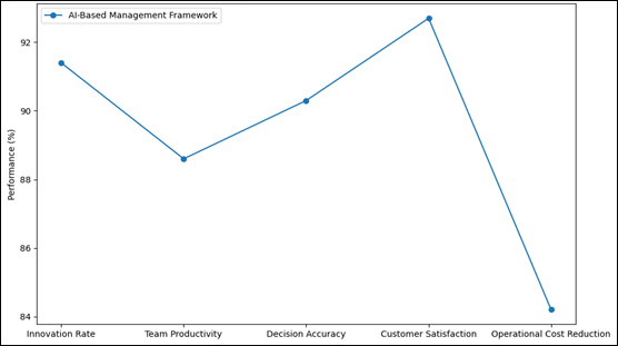 The Figure 3 demonstrates the performance of the AI-based management structure which is at the top in the same parameters. The consistent upward movement of all the metrics implies high flexibility and smart optimization, which AIs allow. The model is very strong in the area of innovation and customer satisfaction, which are over 90 in both measures. The stability of the line denotes the presence of stability in efficiency and less variability of performance. The findings focus on the way automation, predictive analytics and integrating data improve productivity and decision accuracy. The simplified operations of the AI-based framework result in a better management of the cost, which supports the importance of smart systems in the contemporary startup management practices. Figure 4