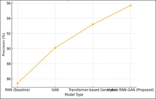 Figure 3 gives the values of precision of the same set of models, and it is observed that there is a steady increase in the value of precision with the evolution of architecture. The baseline of the RNN achieves 85.4% which is moderate and GAN reaches 90.1% because of the refinement features of the generative model. The Transformer-based Generator goes the extra mile by improving the accuracy to 93.2% with the ability to model long-term relationships. The Hybrid RNN-GAN records the best accuracy of 95.7 which indicates that it has the highest capacity to generate dance movements that are closely related to the actual movement patterns. The trend is improved by the fact that the model has a lower error rate and increased fidelity in choreography sequence synthesis. The research proposes a shared ownership system in which the credit is shared between human contributors and the algorithm system. Artistically, AI creates new limits to creative thinking by producing new patterns of movement that can be interpreted and improved by human choreographers. Such a collaboration establishes a new definition of artistic authorship, as a spectrum between a human intuition and machine learning. The transparency and the provenance of the datasets should be of priority, so that the person should be attributed fairly. Practically, the future models can combine emotional conditioning and multimodal fusion in order to enrich the interpretive richness. 5. CONCLUSION The discussion of AI performed dancing moves and copyright of creations shows that the digital age has changed the understanding of creativity, authorship, and artistic collaboration significantly. This intersection between deep learning architectures like RNNs, GANs, Transformers and diffusion networks has made it possible to autonomously generate expressive, rhythmically coherent, and style rich choreographic sequences. Such technological systems are not just work tools but work partners who can read, innovate in the aesthetic and emotional aspects of dances. The findings reveal that AI has the ability to reproduce human motion patterns with a high degree of effectiveness and introduce new forms of motion that cannot be achieved with the use of traditional choreography. The development of the computational creativity also raises complicated ethical and legal issues related to the intellectual property and authorship. Conventional models, which focus on human intentionality and originality, find it difficult to integrate with algorithmic generation, in which creativity is determined by mathematical optimization, but not design. Lack of legalization of machine-generated works makes the ownership of such works unclear between the choreographers, developers and AI systems. This requires the paradigm shift towards collective or hybrid authorship in which a model of human direction and algorithmic additional input is recognized. Finally, AI-generated choreography is one such example as it represents a new form of artistic production in which co-creation, as opposed to competition, is the paradigm. Through a combination of human expressivity and machine intelligence, dance is becoming a place of hybrid creativity that crosses modern artistic lines. This synthesis does not only increase the creative possibilities of the performance arts, but also puts societies to the task of reinventing originality, agency, and ownership in a more intelligent artistic ecosystem.