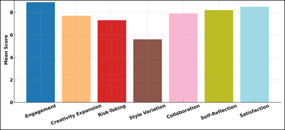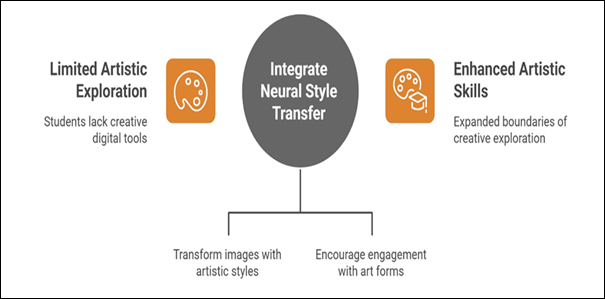 exploration of aesthetic possibilities in the creative process. 7. Conclusion The study prove that Neural Style Transfer (NST) is an efficient and disruptive solution in art education that can go a long way in enhancing the growth of the students in their creative and digital skills. These findings suggest that the students created aesthetically powerful stylized images that were well balanced in terms of color and texturally rich portraying significant interaction with algorithmic aesthetics. The level of high creativity indicators including a creativity expansion index of 7.7 and risk-taking behavior of 7.3 demonstrate that NST promoted experimentation, divergent thinking, and exploration of hybrid visual styles. The satisfaction levels among students using AI in artmaking were largely positive based on high satisfaction rates and collaboration levels during workshops. Critically, the research indicated that the levels of digital literacy improved significantly, as the rate of acquaintance with AI tools increased by 151 percent, and the general digital literacy level grew by 42 to 81 percent. These transformations reveal the didactic importance of implementing AI technologies that are available in the art curriculum. Despite the fact that students at times faced some challenges of parameter adjustment, balance of style and content and processing limitations, this did not impede the overall learning outcomes, rather it enhanced deeper thinking and problem solving. The analysis of the results comparing them to the prior studies supports the statement that AI tools, specifically NST, have the potential to stimulate creative interaction and raise critical discourse concerning authorship and artistic agency. In general, the research findings demonstrate that NST can be a significant direction towards creating a digital creativity, broadening the artistic potential, and priming learners to a future where human-AI co-creation is a major concern in artistic practice.