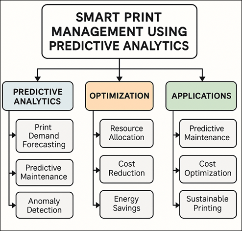 1. INTRODUCTION A new solution has been introduced to the critical technology that is being applied in the contemporary organizational setting, where efficiency, sustainability, and cost optimization are the main priorities. Enterprises that have continued to produce large volumes of print jobs like administrative documents, operational forms among others tend to be inefficient in conventional print management systems, which usually fail to mitigate factors like waste of resources, unwanted downtime, and irregular distribution of loads among devices Advisera. (2017). These disadvantages have a direct effect on the productivity of operation and environmental sustainability. As the volume of data-driven technologies has increased exponentially, predictive analytics has emerged as a strong enabler that allows print ecosystems to change their reactive, manual-driven systems into proactive and intelligent systems. Predictive analytics is a statistical modeling, machine learning, and real-time monitoring system that is used to predict print demand, predict equipment failures, and optimize resource allocation. In a smart print system, the historical print logs, user behaviors, toner consumption trends, and device health signals could be analyzed to enable organizations to anticipate the operation requirements in advance before problems occur as depicted in Figure 1. This allows making a transition to predictive maintenance, minimizing unexpected downtimes of printers, minimizing the number of service interruptions, and improving the reliability of print infrastructure Kryvinska (2012). Future print volumes, schedules of toner depletes, and unusual usage patterns, which can signal misuse or cyber threat can be accurately predicted using predictive models, including ARIMA, LSTM, and Random Forest. Figure 1