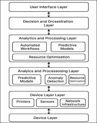 The other research direction that is developing is anomaly detection in print systems. A spike in print volume that is unusual as well as attempts to enter the system without authorization and unusual patterns of behavior can be signs of security threats or abusive use. Outliers and protection of print infrastructure have been detected using machine learning models, especially isolation forests and clustering algorithms. Literature also points out the significance of print behavior analytics, in which user data is monitored on an individual user level to find areas of inefficiencies, impose restrictions, and promote printing behavior that is eco-friendly. Along with the predictive methods, there are also studies on the best strategies of print routing and load balancing. They use optimization algorithms to allocate the print jobs in accordance to the availability of devices, cost, energy consumption and estimated workload. It has been demonstrated that hybrid systems that combine predictive analytics and optimization models can be effective in reducing delays, lowering maintenance charges and enhancing the overall performance of the print fleet. Although the current literature offers useful information on the topic of IoT integration, machine learning-based models, and routing optimization, there are still considerable gaps. A lot of them work on small-scale settings and cannot prove their effectiveness at big businesses. There are also interoperability issues because printers and proprietary data formats and incompatible management protocols are heterogenous. Another significant issue is the security of data since print logs can hold sensitive information about the organization. In addition, there is scanty literature on the hybrid cloud-edge analytics frameworks integrating local real-time processing and centralized long-term prediction framework. 3. System Architecture for Smart Print Management Using Predictive Analytics The use of a strong system architecture is required to facilitate the change to the traditional, reactive print environment to the intelligent, analytics-driven print ecosystem. The Smart Print Management Architecture suggested combines IoT-based networks of printers, real-time monitoring, predictive models, and automation of decisions to ensure the optimization of resource utilization, decrease the downtime, and increase the reliability of the operations. The architecture is implemented as a multi-layered system with every layer having a particular role to play in implementation of the end-to-end intelligent print management. The Device Layer lies at the center of the architecture, and it consists of a network of printers that are interconnected, have sensors, and are capable of communication. Such gadgets produce the telemetry data, i.e.: toner and ink readings, page printing, temperature and paper jam alarms, print job information, and wear data on the component parts. Contemporary enterprise printers are SNMP or REST API-enabled or use the MQTT-based message exchanges to communicate data to and from the printers. The non-homogenous character of printer models is resolved with the help of protocol adapters standardizing data format. Interoperability of devices at this layer is the basis of ensuring reliability and large scale monitoring as in figure 2. The Data Acquisition Layer manages the real-time gathering, mixture and pre-processing of data of dispersed print devices. This layer used IoT gateways, edge nodes or cloud ingestion pipelines e.g. Apache Kafka or Azure IoT Hub in order to provide a data flow that is continuous and fault-tolerant. This layer performs data cleaning, feature extraction, synchronization of timestamps and anomaly filtering to provide the high quality inputs to the downstream analytics. Systems that have latency-sensitive applications like immediate fault detection edge analytics nodes have preliminary analysis to reduce reliance on cloud servers and enhance responsiveness. Figure 2