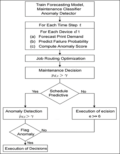 Step 2: Every time step Forecasting Model (Print Volume Prediction) Step 3: The system is used to provide load balancing, reduce delays, and optimize use of resources without violating device capacities and service-level constraints through the inclusion of predicted workloads. Step 4: Predictive maintenance decision is made based on the predicted probability of failure of an individual device using the algorithm. When the projected risk is above a preset threshold the system automatically sets up a maintenance time frame on said device. Step 5: The algorithm will then deal with security and operational anomalies. In case the anomaly score calculated in Step 2c exceeds a threshold, the system considers that the device or job is anomalous. The detection mechanism provides the possibility to track abnormal usage in time, possible cyber-attacks, or new malfunctions of the operations that need to be provided with immediate care. Step 6: After analyzing and deciding what to do, the algorithm studies the optimization actions that have been developed in the first steps and puts them into practice. This encompasses implementing the best decisions of routing the print jobs, revising the maintenance schedule with the devices that have been identified as anomalies, and sending anomalies notifications to the administrators of the system. These measures bring about real time adaptation and continuity in operational efficiency. Figure 3
