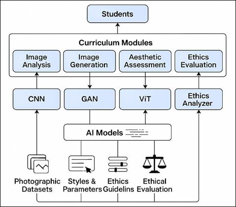1. INTRODUCTION The introduction of Artificial Intelligence (AI) in the education of art, especially photography as the field, is a revolutionary change in the processes of creating works as well as in the organization of the educational process. Manual skill, aesthetic judgment and theoretical understanding of light, composition and color are the classical values of the traditional photography curricula. Nevertheless, the high rate of the development of AI technologies, such as machine learning (ML), computer vision (CV), and generative models, has reshaped the scope of visual creativity. An AI-Driven Photography Curriculum at Art Schools has attempted to become a union of precision and accuracy of computational intelligence with an aptitude of the human art, making it possible to create a new generation of photographers able to co-create alongside intelligent systems Yi (2025). It is not conclusive that in the new digital world, algorithms ceased to be passive participants in the creating process but active agents of the creative process. Such models as Convolutional Neural Networks (CNNs) and Generative Adversarial Networks (GANs) allow automated feature extraction, style synthesis, as well as real-time image enhancement, which provides photographers with new opportunities to experiment and express themselves. Convolution operation is the basis of the functionality of deep learning systems that identify and comprehend the visual patterns in the images. With these mathematical underpinnings, students will get to understand how neural networks process pixels, recognize textures and create photoreal images He et al. (2025). In addition, AI opens new possibilities of individual learning and feedback of adaptation in the field of training photography. Through predictive learning algorithms, the curriculum is able to evaluate the performance of the students and will suggest specific exercises to optimize the pedagogical gains Yan et al. (2024). An example is that a loss metric like the mean squared error can be used to measure the accuracy of automated aesthetic assessments or object recognition problems. Combining these mathematical notions will guarantee that the learners not only use AI tools in a creative manner but also learn their algorithmic basis, which will promote, not to mention artistic development, computational literacy. The curriculum also focuses on the creation of generative art, in which GANs that consist of a generator and discriminator are trained in adversarial learning to generate new images which mimic actual photographic styles. The optimization issue is a typical example of how deep learning models managing creativity and realism can be achieved, and this aspect is crucial in AI-driven visual synthesis Bethencourt-Aguilar et al. (2021). In addition to technical skills, the curriculum also addresses the aspect of ethics and philosophy, considering the fact that AI-produced images disrupt the traditional concept of authorship, originality, and ownership of creative products. The topic of bias in datasets, algorithmic transparency and intellectual property rights promote the critical thought process of the societal and cultural implication of AI in visual art. Also, courses on smart editing tools, automatic curation and aesthetic analytics equip students to perform in the professional sphere where AI-based workflows are becoming more commonplace Bethencourt-Aguilar et al. (2021). Combining algorithmic thinking with sensibility towards aesthetics, the curriculum seeks to produce artists capable of balancing human creative ability and artificial intelligence as their connection changes over time. Finally, the AI-based photography curriculum turns the art educational field into a multidisciplinary field where technology enhances imagination and reinvents the nature of how photography is done as well as how it is taught in the age of intelligent art. 2. LITERATURE SURVEY The collected literature provides a multi-faceted image of the manner in which AI technologies and, in particular, models applied to photographic and aesthetic assignments could be incorporated into the curriculum of art-schools. On the most general level, general studies of AI in education define a solid argument on the adaptive systems and quantifiable learning outcomes Wang et al., (2024), Wadibhasme et al. (2024). These reviews highlight that AI can make instruction personalized and give feedback loops that are pedagogically effective in acquiring skills and engaging in creative practice that is iteration-driven. Such general evidence in education forms a basis over which a domain-specific experimental work could be undertaken in art and photography programs Heaton et al. (2024). Developments (generative models GANs) Bian et al. (2025) occur both in the literature as research subjects and as pedagogical instruments. He et al. (2025) and other related studies show that GAN based auxiliary systems are capable of drawing images to sketch and offer immediate feedback in form of visual feedback which is low-friction and encourages ideation and experimentation among students. The Le Monde Culture. (2025) controlled experiments show greater engagement and self-efficacy in case of AI-generated imagery scaffolding as an assignment, so generative tools may expand the creative space where learners operate and pose threats to authorship and overdependence. Technically, there are signs of rapid development of model architectures applicable in photographic aesthetics in the literature. The novel metrics Vision Transformers (ViTs) and hybrid CNN-Transformer designs have recently beaten traditional CNNs on Image Aesthetic Assessment (IAA) tasks particularly when innovations do not destroy multi-scale compositional information (the Charm tokenization approach is one such example) Bethencourt-Aguilar (2023). The implication of such technical advances is that now, it is possible to encode more reliably the compositional 