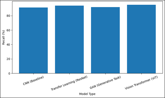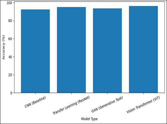 2 Model Accuracy Performance Parameter Comparison The Figure 2 presents a visual comparison of the accuracy of all four models and Vision Transformer (ViT) is the best model with accuracy of 96.3. There is also excellent accuracy of the Transfer Learning (ResNet) that makes 95.1% whereas the baseline CNN makes 92.4%. This graph illustrates the gain of sophisticated architectures, and deeper and transformer-based models have a higher recognition reliability. The highlighted visual distinction highlights the possibility of applying hybrid or pre-trained models to the AI-driven photography education in order to improve the accuracy of the aesthetic and compositional analysis processes. Figure 3