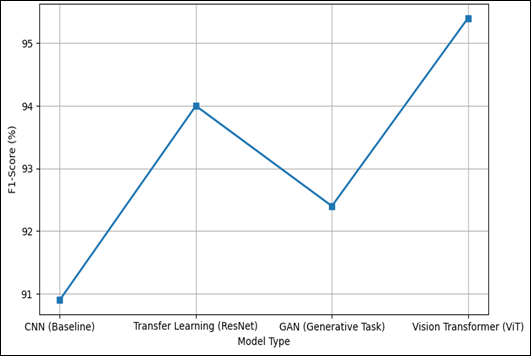 Performance Parameter Comparison The Figure 4 on the recall comparison demonstrates the capability of the models to identify the relevant instances correctly. ViT again takes the lead with 95.2 then ResNet with 93.8, which are indicative of their good generalization ability. The CNN (91.2%) and the GAN (92.0) are moderately good in terms of retrieving all relevant samples but are not that good as compared to other retrieval methodologies. This comparison is used to show that deeper architectures result in fewer detections missed, thus covering all image categories. The larger the value of recall, in the educational setting, the better the students understand the patterns of photographs, and AI-assisted modules can have greater analytical insights and automated feedback when presenting creative projects to students. F1-score represented in the figure (5) combines precision and recall and gives an equal measure of model performance. The ViT has the best F1-score (95.4%) which proves its overall strength. ResNet has 94.0% followed by GAN and CNN with even less different values, indicating their relative trade-offs among precision, recall. The line pattern can be used to explain the equilibrium between recognition reliability and accuracy in advanced models. In AI-based photography, the higher the F1-score, the greater the interpretative potential to make AI help students better perceive images, improve composition, and make aesthetic judgments, which encourage computational creativity in art schooling. Additionally, the ethical and interpretive aspects of the curriculum make sure that learners are actively involved in the process of critical consideration of AI implications on authorship, originality, and aesthetics. The integrated analysis assures that having a balance in approach between computational rigor and artistic freedom can help students to create a balanced command of the artistic intuition and technological accuracy. In this way, the AI-inspired photography curriculum creates a disruptive educational pattern that reinvents the concept of art schools producing digital era photographers who have the ability to create meaning together with intelligent systems. 5. CONCLUSION The introduction of Artificial Intelligence into the field of photography is a major step toward the redefinition of creative pedagogy and exploration of art. All the literature reviewed shows that AI-based tools, including Convolutional Neural Networks (CNNs), Generative Adversarial Networks (GANs), and Vision Transformers (ViTs), have the potential to improve both analytical knowledge and creativity in art schools. The AI enhances the learning experience through the combination of technical accuracy and aesthetical creativity through adaptive feedback, real-time image evaluation, and generative modeling. Research indicates that there are quantifiable gains in the engagement, customization, and visual literacy in the case of the incorporation of AI into the structured education system. Besides, explainability tools like saliency visualization and ethical awareness modules will be used to make sure that students think critically about the AI outputs and the learning will be turned into the reflective, co-creative dialogue between human imagination and machine intelligence. Nevertheless, there are still certain issues of data bias, the authenticity of authors, and the usability of complex AI models to the art education setting. To solve these problems, there is a need to combine efforts of technologists, educators and artists in the design of ethically correct, pedagogically inclusive curricula. Finally, AI-inspired photography curriculum is a visionary educational paradigm with creativity and computation in perfect balance. Such a strategy makes future photographers independent across both technical literacy and creative vision in order to use artificial intelligence not just as an instrument, but as a cooperative agent in the creation of new forms of visual narrative and aesthetic enquiry.