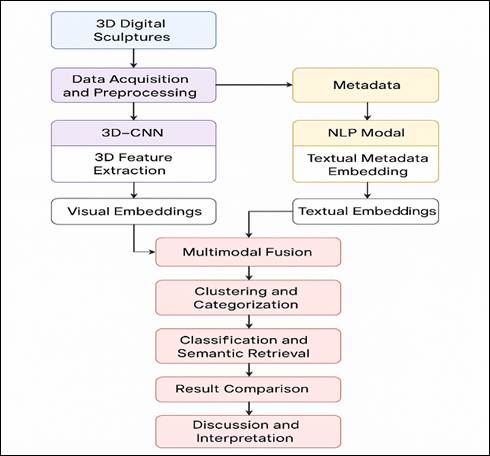 1. INTRODUCTION With the emergence of digital technologies, the preservation, organization and to accessibility of cultural heritage has changed dramatically. Digital sculpture archives have a very important place among the other types of digital heritage because they capture intricate geometries [3D], artistic practices, and cultural histories that go beyond geographical and temporal space-time Mahesh et al. (2025). The conventional approaches to archiving based on manual cataloguing and traditional metadata marking are becoming insufficient during the era of the immense scale, variety, and multimodality of digital sculptures. Such artifacts are frequently high-resolution 3D models, surface textures, material, and a textual description that needs intelligent processing and integration. Here, the Artificial Intelligence (AI) offers a disruptive direction in the administration of digital sculpture collections through automated classification, retrieval, and interpretation aspects Mohapatra (2021). The AIs, specifically the methods based on deep learning, computer vision, and natural language processing (NLP), allow machines to perceive the visual, structural, and contextual features of the sculptures and classify them into categories Parmar and Mishra (2021). An example of this is the 3D Convolutional Neural Networks (3D-CNNs) that are capable of analyzing the spatial attributes of sculptures by convolving volumetric data to extract Curvature, topology, and texture attributes. Simultaneously, textual metadata is viewed as a form of embedding the NLP models this way so that the resulting semantic meanings come out of the descriptive annotations or curatorial notes Kumari (2023). This combination does not just improve the level of retrieval but also allows cross-modal searching, wherein the user can query the visual features by the use of text or vice versa. In addition, the application of clustering algorithms like K-Means or Density-Based Spatial Clustering of Applications with Noise (DBSCAN) can be used to group sculptures of similar art styles or geometries or materials, which facilitates better organisation and discoverability of the archive. The management system also adopts Explainable AI (XAI) methodologies to ensure the provision of interpretability of results of classification and retrieval and transparency to the curators and researchers Sokhi (2023). The performance and scalability of the system are evaluated using evaluation metrics like precision, mean average precision (mAP) and retrieval time. Besides technical progress, the AI-controlled management of sculpture archives is also used to make the culture more accessible to everyone by allowing museums, researchers, and end-users to discover and study sculptures through interactive means across the worldwide collections of the objects Singh et al. (2022). The system fills the art, technology, and scholarship gap by means of automated metadata creation, semantic linking and intelligent visualization. Thus, adding AI to the digitalization of sculptures is a paradigm shift to a new intellectual approach to managing cultural heritage, which does not only retain aesthetic and historical quality of sculptures but also makes them easier to interpret, more accessible to people, and more sustainable in the future. 2. Literature Survey One of the main findings is that the choice of geometric representation voxel, point cloud, or mesh is one of the main design choices that determine the performance and scalability of downstream. Volumetric 3D-CNNs are intuitively extended 2D convolutional paradigms to the 3D volume, are good at hierarchical feature extraction, but their memory footprint scales cubically with resolution, limiting their use to the high-detailed cultural artifacts Akshath Rao and Mehta (2023). There is a definite inclination toward convergence in the literature on multimodal fusion joint embedding of visual geometry and textual metadata. Experiments over and over have demonstrated significant improvements in retrieval and classification in using structural embeddings together with contextual text embeddings. The integration strengthens semantic convergence: textual descriptions include provenance, iconography, and scholarship which cannot be expressed using geometry, whereas geometry includes stylistic and material information which cannot be expressed using text Chaudhari and Shrivastava (2024). Effective fusion strategies can be as straightforward as a weighted linear combination, learned cross-attention modules; but the quality of quality aligned pairs and the ways to offset modality imbalance is determined by those Milani and Fraternali (2021). This combination of opportunity and risk makes the fusion step, therefore, an engaging element: the alignment and balancing of data between different modalities will yield substantial rewards to multimodal systems; the lack of metadata or noise in the metadata across different modalities can lead the fusion process to propagate errors. The amount of metadata understanding improved significantly with the use of transformer-based language models. Their context-sensitive representations are better than TF-IDF and previous recurrent-based curatorial language models, particularly with fine -tuning of their models on domain specific collections Pati and Choudhury (2024). However, pretraining-domain mismatch (as is typical with web-scale general models) turns out to be a pitfall here: models that have been pretrained on web-scale general content must be carefully fine-tuned or domain-adaptive pretrained on museum catalogues and scholarly descriptions to understand art-historical terms and subtlety. This preprocessing minimizes the computational burden and normalizes the input but has to be configured to avoid losing stylistically significant features (e.g. tool marks or delicate decorative features on surfaces) that can prove critical when performing a scholarly analysis. Clustering as 