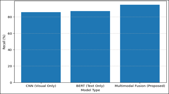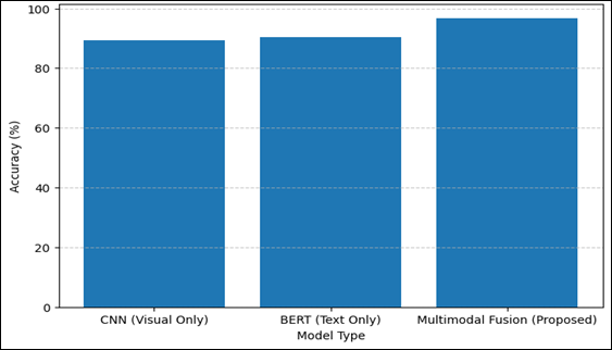 Graphical Representation of Accuracy of Different Models The Figure 2 shows that Multimodal Fusion model is the most accurate (96.7%), than both CNN model and BERT model. The plain CNN is a poor performer since it does not have semantic context whereas the plain BERT performs marginally well. Figure 3