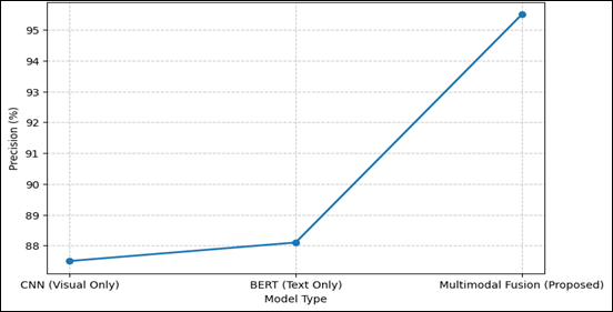 Graphical Representation of Precision of Different Models Precision curve shows that there is a gradual increase in the precision among the models with the proposed fusion model exhibiting better precision (95.5) due to balanced visual-textual learning. Figure 4
