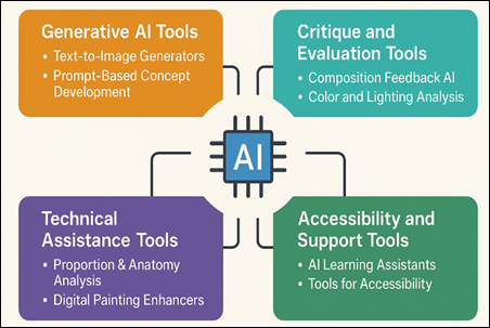 The use of AI is also associated with accessibility and inclusivity. AI-assisted previews or instructions can be used to help learners with physical disabilities or little prior experience with art become confident. In the case of learners with different cultural backgrounds, AI may offer a more wide range of artistic events than a typical textbook. 3. Using AI as an Art Educational Tool in the Art Curriculum The introduction of artificial