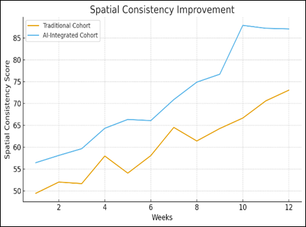 The chart shows the change in the scores of spatial consistency of both the traditional cohort and the AI integrated cohort throughout the time frame of 12 weeks of instruction. Although the trend in both groups is favorable, positive, and upward, the AI-integrated group exhibits a significantly stronger upward curve. The AI-aided students begin at a slight advantage in Week 1 only to create a wide gap as the weeks roll on, especially after Week 5 when AI-aided visual analysis tools enter the reflective action plan. Their scores increase consistently, reaching its peak at Week 10 with a strong increase that demonstrates a strong improvement in depth perception, alignment accuracy and compositional stability. Conversely, the conventional cohort advances at a slower rate, and the skill acquisition is evenly distributed across time, as the conventional method of critique and practice. At the Week 12 level, the AI-integrated group continues to score the consistency of spatial perception at the mid-80s range, and the traditional cohort is close to the low-70s range. On balance, the graph emphasizes the speed of spatial awareness and structural knowledge development in students trained on AI-enhanced post-practices in comparison with the traditional training. In the last four weeks, the students had to perform a major project, the complete sketch in charcoal of a live model. Each student, along with their completed work, provided an "AI Reflection Log" documenting the time they used AI, what it taught them and how they incorporated or disregarded its advice. This generated a quasi-pedagogic effect: students were better able to express their visual reasoning and be more conscious of their choices of what to observe. Figure 6