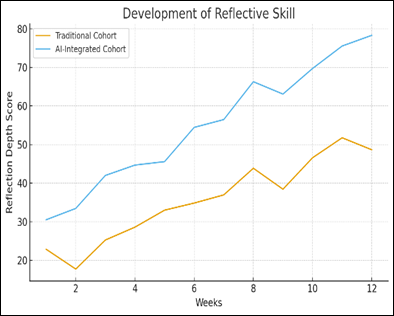 The graph 6 indicates gradual increase in the reflective skill of both kohorts within the 12 weeks period, but the AI-integrated group indicates a significant sharpe increase. Although the two groups start with a low reflection score, AI-assisted group scores increase fast after Week 5, and group 2 gains higher self-assessment, better awareness of errors, and more deliberate planning. By Week 12, they are scored in the 80s range, as opposed to the traditional cohort’s mid-50s. These findings are consistent with the general case study results: the proportional accuracy, the spatial consistency, and the overall confidence in the error diagnosis increase when students apply AI to work after they have completed their work and retained their personal artistic voice. The evidence indicates AI as a post-practice analytical tool and not as an active drawing aid can increase the technical awareness and depth of reflection and has no effect on creativity. There is no replacement of traditional pedagogy, but rather an enhancement and greater clarity with regard to intellectual artistic development. 7. Conclusion The introduction of AI tools into the existing art education means a transformative opportunity with the help of mindful pedagogy and explicitly set boundaries. This paper illustrates that AI has the potential to enhance technical aptitude, enhance reflective learning and broaden creative exploration without reducing the haptic and experience basis of a studio practice. Its successful implementation requires sequencing, i.e., that manual work comes first and then AI comes in, as well as positioning AI as an analytical collaborator, and not a creative competitor. According to case study evidence, there are quantitative benefits of proportional accuracy, spatial reasoning, and self-evaluation with the use of AI in a controlled and post-practice ability. Meanwhile, the students still had stylistic personalities and claimed to feel more confident when it comes to their self-diagnosis. In drawing, painting, sculpture, concept art and art history, AI enhances learning by applying discipline specific strategies that prove that AI is flexible in its application throughout the curriculum. In the end, AI does not substitute the hand of the artist; it sharpens it and provides new vantage points that can be beneficial to improve the perception, understanding, and creative decisions. Planned AI can and will co-exist with conventional practices, and create a future where technology can assist, not replace, the human imagination.