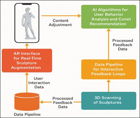 preserving the engagement, level of emotion, and learning effectiveness. 7. Conclusion The integration of the Augmented Reality (AR) and Artificial Intelligence (AI) is the new idea of reconsidering the sculpture exhibition, which is the possibility to unite the physical piece of art with the online engagement. The paper demonstrates that a combination of these technologies may yield immersive, adaptive, and educational experiences which can transcend paradigms of looking at art. AR contributes to the perception through the visual addition of the digital enhancements of the real sculpture due to the visualization, the contextual narration, and the active exploration. Meanwhile, the AI will provide the opportunity to tailor the content smartly, i.e. analyze the user behavior, preferences, and emotional responses to tailor the content dynamically and thus make the experience of each visitor personal and meaningful. The proposed framework and system architecture is a nice balance of AR interfaces, AI-driven recommendation systems and data-driven feedback loops with feedback and a continuous learning cycle that is built as people interact with it. The experiment on the prototype validated measurable increase in immersion, engagement and knowledge retention in comparison to the regular exhibitions. There was also higher emotional attachment of the subjects, interactivity and heightened sense of agency on the hybrid digital space. Not only the viewers, but also the curators, educators, or even digital artists, such integration can be helpful and can enable them to make a data-informed decision and to come up with adaptive content. It facilitates inclusivity since it contributes to multiple styles and requirements of accessibility and expands the participation in the arts.