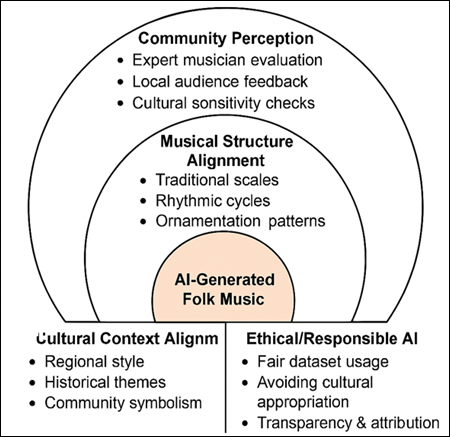 The attributes of metadata often used to construct a well-structured dataset in a dataset usually comprise geographical area, rhythmic period, melodic scale, type of instrumentation used, lyrical theme, the performance setting, and historical context. The addition of these metadata makes the model more interpretable, and AI can produce compositions of a certain culture instead of arbitrary melodies vaguely based on folk forms. As an example, Indian folk databank can contain raga associations, cyclic rhythms in keherva or dadra, and instrumentation, such as dholak or bansuri. The Irish folk repertory can incorporate ornamentation, such as in the form of rolls or cuts, whereas the African repertory can incorporate polyrhythms and communal patterns of the call and response. Another very important process is audio preprocessing. Good folk recording might need to have noise removed, beat-matched, pitch-detected, and the recording divided into motifs or phrases. The use of symbolic datasets represented in MIDI or ABC notation makes melodic modeling possible but would tend to lose the specifics of ornamentation, timbre or microtonality that are culturally important. Thus, the folk music generation is better based on the dual-mode dataset, which is a combination of both symbolic and audio representations. 5. Cultural Relevance and Authenticity Evaluation To determine the cultural relevance and authenticity of AI-created folk music, it is necessary to consider it in a multidimensional framework, beyond technical accuracy. Much of the meaning of folk music is contextualized: stories that it tells, rituals it accompanies and emotions it expresses in particular cultural contexts. Authenticity, in its turn, cannot be evaluated based only on the melodic or rhythmic fidelity but must take into account whether AI-generated products have anything substantive to say about the cultural identity and historical depth of traditional performances. A stylistic faithfulness is one of the dimensions of authenticity [12]. This can be done by evaluating the extent to which AI-music is aligned to tonal structures, rhythmic patterns, phrase patterns, and ornamentation patterns of a specific tradition. Deterministic indicators (i.e. pitch distribution, rhythmic entropy, motif similarity, etc.) can be used to determine the degree to which generated works match conventional styles. Subjective assessment like that by the folk musicians or ethnomusicologists gives more insight into the expressive and cultural overtones. The other dimension is cultural coherence that assesses