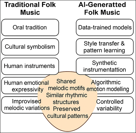 1. INTRODUCTION AI has become a ground-breaking innovation in the creative industry, and it fundamentally changes the modality of production, distribution and perception of music in modern societies. Although AI-generated music has achieved greater popularity in pop, classical, and ambient genres, its use with folk music brings about an interesting point of intersection of technology and culture. In its utter vulnerability to technological redefinings, folk music is simultaneously a more productive and delicate canvas since it is highly rooted in community identity, oral traditions, and past continuity. The twofold aims of cultural preservation and creative exploration promote the increased attention to the use of neural networks, sequence models, diffusion processes, and large transformer architectures on folk music Su et al. (2019). As globalization threatens to erode most regional folk traditions globally, oral tradition is shrinking, and there is less and less generational involvement, AI offers an option to record, rebuild, and rethink these fading soundscapes. Nevertheless, the adoption of AI in folk music poses serious concerns on authenticity, representation, legitimacy, and acceptance by the community Li (2021). Folk traditions unlike other musical forms have emotional, ritualistic, and socio-cultural significance that surpass the musical forms. It means that AI-generated folk music should be considered not only in terms of technical precision or fluidity of the melody but also in the context of cultural sensitivity and social responsiveness Li et al. (2022). Figure 1
