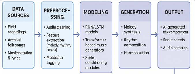 The use of AI in this field provokes more general discussions regarding computational creativity and the copyright of cultures and the ethics of the production of cultural products through the use of algorithms. In addition, as the models of generating content continue to become more and more able to reproduce more complex musical forms, it is essential to study how much such works are able to respect, distort or alter the customary practices as represented in Figure 1. The research paper examines AI-composed folk music concerning cultural relevance, technical innovation, and perception of the community. The paper will fill the gap between the technological capability and cultural meaning by discussing generative models, dataset building, stylistic attributes, authenticity, and cross-cultural case studies Silva and Oliveira (2024). The main argument of the research is that AI-based folk music can significantly contribute to the cultural conservation and creative development provided that it is created in the context of the ethical accountability, community engagement, and culturally aware information processing. The paper wraps up by suggesting future trends to make sure that the future AI music technologies are used as the means of cultural empowerment and not as a tool of cultural dilution. 2. Background of Folk Music and Cultural Significance Folk music has always been a source of collective memory, the lived experience, struggle, celebrations, rituals, and identity of a community over the generations. Its nature is not such that it is composed of melodic or rhythms but rather of the social contexts within which it is produced, presented and understood. Folk traditions are not as dependent on notation or established rules of performance, and are usually based on group involvement, improvisation, and oral tradition, which is unlike classical or commercial music. It is what makes folk music a living, dynamic cultural phenomenon, the one that is closely related to the language, geography, social traditions, and ritualistic purposes Zhang (2021). A mix of Indian Baul songs and African drumming, an Irish reel, Appalachian ballads, or Balkan rhythms, each folk style captures a specific cultural story, which was shaped by the history and the surrounding environment. Figure 2