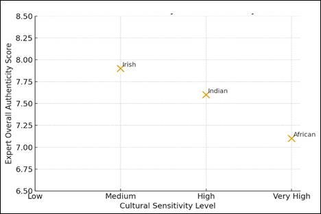 The relationship between cultural sensitivity and expert rated authenticity upon the three folk traditions is represented in the scatter plot shown in Figure 6. One can see a distinct trend: the more culture sensitivity is high, i.e. the more Irish (or medium) then the Indian (or high) then the African (or very high), the less authentic AI-generated music seems to be. This tendency implies that the traditions that are more culturally rich, have more ritual importance or belong to the possession of a certain community must be modeled more carefully and subtly. Indian and African tradition, where microtonality is used, is performance-based, and highly symbolic of the culture, is rated lower on the authenticity scale since it is difficult to represent context-specific features in AI models. The opposite is observed in Irish folk music which is largely documented and less culturally constrained with the highest authenticity rating. This number highlights the necessity of culturally responsible AI usage, especially with the model of music of sensitive or community-oriented traditions. Case Study 3: West African Drumming West African folk music particularly djembe and talking-drum bands are typified by polyrhythms, improvisation by the group, and profound ritual meaning. Audio models trained on these 890 community archives and ethnomusicology recordings were GAN based. Although the models were able to imitate simple rhythmic layers with a score of 8.4/10, they were unable to cope with ensemble interaction, timing variation in dynamic aspects, and call-answer structures which constituted the performance culture of the West Africans. The products created were usually musical in tone but not as lively as live drumming traditions. Table 7