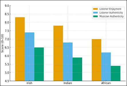 The grouped bar chart shown in Figure 7, indicates that there is a large gap in perceptions between general listeners and traditional musicians as far as AI-generated folk music is concerned. The enjoyment of the listeners is always high in all three traditions, which implies that listeners enjoy the novelty and availability of AI-composed songs. The scores of listener authenticity are lower but still positive, meanwhile, indicating that the majority of listeners do not report minor cases of authenticity problems. Contrarily, there are significantly lower musician authenticity ratings in all traditions. Musicians and experts more particularly enshrined in their cultural forms detect the wrongs like unsuitable ornamentation in Irish songs, inaccurate deviations of the shruti in Indian songs and diminished rhythmic nuances in African drums. Such difference proves that although AI-music could be entertaining to common people, it frequently falls short of the demanding culture and technical standards of conservative professionals. The case has pointed at the shortcomings of modeling music as communal, interactive, and spiritually encoded systems, with algorithms that view music as sequences of fixed disposition, as opposed to social practice. 7. Conclusion AI-generated folk music is a highly impactful but hard-to-understand point of contact between technology and culture. Although AI has proven to be remarkably sophisticated in learning the stylistic elements, creating culturally-inspired music, and assisting in preservation, there are issues of authenticity, ownership, and cultural integrity that also emerge. Folk music is not just a set of musical patterns but a living manifestation of identity developed in accordance with community, history and emotion. This demands that the development of AI systems should be culturally sensitive and ethical. The paper concludes that AI can be used in cultural preservation provided it is done in a respectful, and a collaborative manner. The community engagement, the transparency of the datasets, and ethical principles are the key to enabling AI-generated folk music to enhance the cultural heritage instead of weakening it. As the field of technology keeps on changing, the way forward is to form collaborations between inventors of AI, cultural custodians and artists to make sure that the innovation does not destroy tradition but complement it.