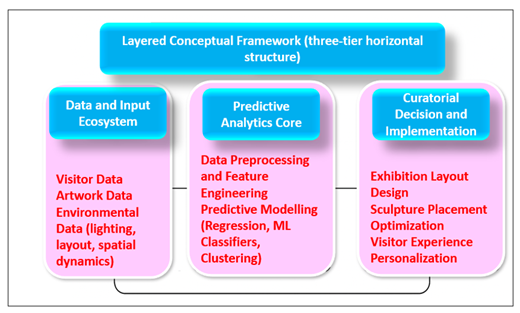 Design-Driven Predictive Exhibition Framework These insights allow curators to make exhibits that not only have some artistic meaning, but also that would be meaningful to a broad audience. Research Research Pertaining to research, predictive analytics in sculpture exhibition planning is interdisciplinary to art curation, computer science, and cultural informatics. It promotes the partnership of the curator, the data scientists and technologists leading to hybrid solutions re-conceptualizing the decision-making of the curator Monaco et al. (2022). This study will therefore aim at developing a systematic predictive model which could be applied to aid in planning an exhibition through data analysis and model prediction as well as visualization tools. The framework will attempt to establish a balance between the data accuracy and the freedom of creative expression by balancing both computational understanding and creativity towards the development of the art exhibition design, which is necessary to establish a sustainable growth of the art exhibition design. 2. Theoretical Foundation The predictive analytics application to sculpture exhibition planning is anchored on interdisciplinary theoretical approach of merging the disciplines of data science, computational aesthetics and curatorial theory. All the three fields of knowledge are united to create a conceptual basis of making exhibition design a thinking, flexible process which is both a synthesis of quantitative anticipation and qualitative enlightenment Ocón (2021). The previous exhibition planning that was largely characterized by curatorial instinctive and analysis of the audience inertia is currently changing to the dynamic and data enriched approaches capable of predicting the visitor behaviour and emotional response. Such an intention to combine algorithmic thinking with artistic decision-making is what places the establishment of predictive curation a paradigm in which exhibitions are built not only to articulate artistic ideas and concepts but also to generate measurable popularity among the viewers and efficacy in their functioning Kravari et al. (2022), Mihailova (2021). Predictive analytics are founded on the statistical learning, machine intelligence, and decision optimization in the data science paradigm to predict and comprehend the audience dynamics. It operates within three major structures, data-driven modeling, pattern recognition and decision support integration. The forecasting relations developed by the data-oriented modeling between visitor behavior and features of the exhibitions (type of sculptures, spatial arrangement, thematic regularity, etc.) are created. Pattern recognition identifies recurring patterns like time spent by people around specific sculptures or group of movements in galleries and is able to identify patterns of behavior which can be optimized to attract people. In its turn, decision-support systems could be viewed as a mediator of the interpretation, an analytical finding is transformed into the practical curatorial data. Rather than replacing the curator, those systems enhance the authority of the creative choices with the data-driven recommendations guiding the plan of design contingent on the timing and addressing the audience. Table 1
