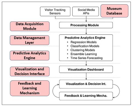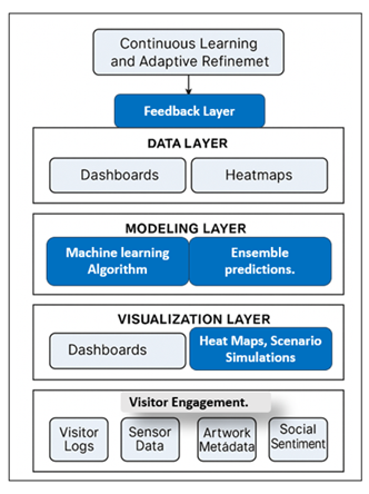 Step 4: Predictive Model Development After the feature engineering stage, predictive models are built to predict visitor engagement, attendance, and dynamics of spatial flow. The modeling step incorporates a set of algorithms depending on particular goals. Continuous outcomes that can be predicted by regression models include the number of visitors or average time of engagement, and classification models can be used to classify sculptures or zones as high, medium, or low engagement levels. The clustering algorithms identify the grouping of behaviors among visitors and discloses concealed typologies of the audience. Time-series models are used in examining attendance patterns over time in order to predict seasonal or daily variation of visitors. To increase robustness, the ensemble learning algorithm like the Random Forest or XGBoost can pool together several different algorithms to decrease the overfitting of the algorithm and increase predictive stability. The products of these models, which are engagement probabilities, trend curves, and clustering maps, give the curator information-informed guidance on how to design the exhibition and when to schedule the exhibition. Step 5: Validation and Optimization The fifth step is concerned with the evaluation of model reliability with the help of validation and refinement. The predictive accuracy is measured based on statistical measures of precision, recall, and R 2. Cross-validation, also known as k-fold partitioning, is a method that is used to study how models perform in different data subsets. The process of parameter tuning aims at optimization of hyperparameters to obtain optimal predictivity without a detriment on hyperparameter interpretability. Mistakes and inaccuracies between the predicted and actual behaviors are examined to detect or identify systemic prejudices or restricted conditions. Step 6: Visualization and Decision Support Here, the results of the analysis are then converted into visual understanding by the means of intuitive dashboards and curator-specific decision-support systems. These visual tools enable curators to view, what-if, the trial of how variations of layout, lighting or placing of sculptures can vary visitor experience measures. Interpretability tools are also incorporated in the decision-support layer where predictive suggestions are clear and understandable. This visualization stage is the intermediary between the algorithmic intelligence and the creative ability of artists by facilitating data-driven creativity without limiting the freedom of the curators. 4. Implementation and System Prototype Using predictive analytics to plan the sculpture exhibitions can bridge theoretical models and the algorithmic design approach and practical, operational prototype that can be utilized by the curators and exhibition managers successfully. The present system prototype is an evidence of concept of the implementation of machine learning models, the visualization dashboards, and the decision-support interfaces into the exhibition ecosystem. The implementation phase fills in the gap between computational modeling and the actual curatorial work process to make sure that analytical intelligence is not a separate analytical tool as an external entity, but is rather a natural part of the creative process. The system architecture is modular in nature whereby the individual components are well defined and the interaction between the components is through structured data flow channels. The data acquisition module is the module that constantly receives the input, which comes in the form of heterogeneous sources, including visitor tracking sensors, social media APIs, museum databases, and environmental monitoring devices. All these inputs are combined into a centralized data management layer which is driven by cloud-based storage solutions allowing access in real time and scale. The next processing module involves preprocessing scripts of data cleaning, normalization, and transformation based on frameworks, including Python Pandas and NumPy libraries. This guarantees the consistency of all the incoming data prior to their entry into the predictive analytics engine. This is where the heart of the system, the Predictive Analytics Engine, is situated, which uses the models mentioned in the foregoing section, namely regression, classification, clustering, ensemble learning, and time-series forecasting. This engine is implemented by a modular machine learning pipeline with tools such as Scikit-learn or TensorFlow and therefore models can be trained and tuned quickly. All the sub-models are in a complete prediction matrix that reflects various analytical aspects of the exhibition: visitor engagement, spatial flow, aesthetic resonance, and attendance forecasting. These findings are then inputted into a Result Integration Layer, the results are balanced and weighted according to the confidence scores or according to priority set by the curator. The middleware API layer provides integration between modules, which provides a seamless flow of data between the data infrastructure, machine learning engine, and visualization interfaces. This layer will interoperate and enable the constant revision of data in live exhibitions. As visitor patterns adjust dynamically (through more people entering a particular area of the gallery or extended time spent on certain artworks) predictive outputs are rendered dynamically, which then offer adaptive suggestions. Such adaptability in real time makes the system a responsive, continuously changing curator-assistant that can be aware of current exhibitions and make predictions that are better in the future. Figure 3