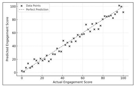 Figure 4 Regression Performance Showing Correlation Between Actual and Predicted Engagement Levels Across Exhibited Sculptures Figure 4, shows Regression Performance Graph, a graph showing the relations between the actual and predicted engagement scores of different sculptures. The thinness of the data points around the diagonal reference line represents a high correlation (R 2 = 0.89) and this proves the credibility of the regression models in ability to predict visitor engagement. This graph proof indicates that the model can be applied successfully to different sculptural situations and adequately predicts the difference in audience attention and interaction. Figure 5