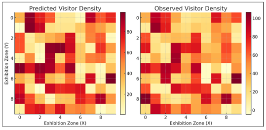 Exhibition Zones Figure 5, shows the Visitor Flow Heatmap, which gives an opportunity to compare the predicted visitor density and observed one across the exhibition areas. The intensity of warm colors denotes the presence of high visitor concentration whereas the cool color tones denote low levels of engagement. The fact that the predictive and observed patterns are highly overlapped in terms of the visual aspect proves the fact that the predictive models are spatially accurate and can be used to reproduce the real-world patterns of visitor movement. These heatmaps also help curators to optimize the spatial layout, showing places with high traffic and low interests, thus helping to better manage crowds and order of the exhibition. Figure 6