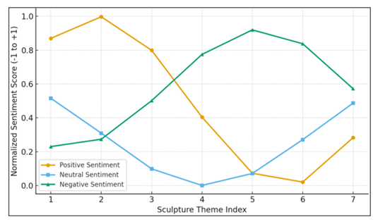 Figure 6 Sentiment Trend Analysis Depicting Public Emotional Response Figure 6 shows the Sentiment Trend Curve, the curve that charts the emotions reactions by the sculpture themes. The line that shows the positive sentiment shows the high levels of enthusiasm of the audience, whereas the neutral and negative trends show the different levels of interpretive resonance on the themes. This visualization confirms the ability of this framework to incorporate the use of computational sentiment analysis in aesthetic judgment. These sentiments trends are more or less consistent with the qualitative responses of the visitor surveys, which proves that predictive analytics can be effective in capturing the affective aspect of art appreciation. Visual analytics was very critical in conveying predictive results. Graphic dashboards were used to display the comparison between the estimated and actual visitor traffic, heatmap of engagements in various exhibition areas, and thematic analysis sentiment curve. 6. Conclusion and Future Directions The Predictive analytics in sculpture exhibition planning shows that data science and design in curatorial can collide to establish intelligent, adaptive exhibition systems. The research confirms a model that determines the interest of visitors, maximizes space allocation, and explains the emotion of the audience by incorporating regression, classification, clustering, ensemble learning and time-series into a single framework. The system prototype demonstrates that predictive analytics can be used to help curators be more farsighted without sacrificing the artistic freedom that allows them to have exhibitions that are both information-driven and emotionally engaging. The major contributions of this study are three. The model has a high predictive reliability operationally (R2 = 0.89, F1 = 0.91) and can be easily interpreted using regression graphs, spatial heatmaps, and sentiment curves. These graphic tools facilitate intricate relationships between data and help curators to refine exhibition plan, visitor flows and thematic arrangement. The feedback loop will result in continuous learning whereby the system can evolve with time as new exhibitions are introduced and the system evolves in response to the interests of the audience. The future research should take three directions, which are AI-based personalization, where predictive offerings can be updated in-the-field along with profile of a particular visitor; simulation environments, where AR/VR may be applied to enable a curator to view data-driven exhibition layouts; and intercultural predictive modeling, where applicability can be extended to a variety of and global audiences. Ethical implication, in particular, transparency and interpretability will become one of the factors in the maintenance of artistic integrity of AI-enhanced curation.