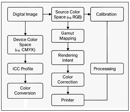3. Theoretical Concepts 3.1. Color spaces (RGB, CMYK, LAB, ICC standards) Color spaces are a mathematical base of the representation and transformation of color in both digital and physical media. Display systems based on light emission using red, green and blue as their primaries are known as the RGB color model of color. Nevertheless, printing is based on the CMYK (cyan, magenta, yellow, and black) subtractive design, in which the dots absorb and reflect light on white surfaces. These two spaces are nonlinear in nature and require complicated transformations to preserve perceptual accurateness. CIE LAB and CIE XYZ are device-independent spaces that are created to give a consistent perceptual representation of color, and are therefore necessary to assess color differences (ΔE), as well as cross-device consistency. Color profiles are defined in standards by ICC (International Color Consortium) and these are used to define the behavior of devices like monitors, scanners and printers so that color manipulation can be performed through standard color transformations. ICC workflows are commonly based on source and destination profiles and thus the color rendering will be accurately rendered in various devices. 3.2. Print Device Characteristics and Color Management Pipeline The printing devices are characterized with exceptional behaviors caused by the differences in the ink formulation, substrate absorption, head accuracy, halftoning, and the environmental factors. The digital input is not the only factor influencing the color output but also physical parameters like dot gain, ink density and surface roughness and temperature. Nonlinear interdependences render the prediction and calibration of color to be quite difficult. Color management pipeline is aimed at ensuring consistency between devices by transforming digital color values using device-independent profiles and using compensation curves. It is modeling of the printer response achieved through calibration, characterization and profiling processes. However, conventional color management presupposes a constant condition of devices and constant linear changes, which does not provide flexibility to deal with real-life changes. Machine learning complements this pipeline with the dynamic relationship of input digital values and printed color results. Based on scanned print sample datasets, and measured color values, the ML algorithms are able to forecast color changes based on conditioned device settings and optimize control parameters. Figure 1 illustrates how architecture is connected with print device properties that are subsequently coupled to a systematic color-handling lineup, based on researches in CNNs to understand spatial and textural influence in printed patterns, and regression and reinforcement learning to optimize ink discharge and income in present time. Figure 1