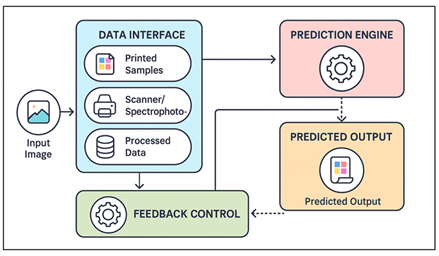Adversarial Networks (GANs) GANs offer an effective platform in the perceptual optimization of color representation. A GAN is composed of two neural networks: a generator which is used to predict plausible color changes and a discriminator which is used to measure how well they change. Adversarial training allows the generator to reduce errors on a pixel level as well as perceptual inconsistency based on adversarial training, which can produce much more natural and aesthetically satisfying images. GANs can create device mappings that optimize color, engage in corrections on metamerism, third-range gamut compression, and are able to capture fine tonal shades. Conditional GANs (cGANs) enable the control of characteristics like brightness or saturation in a fine-grained manner and thus the adaptation to substrates and lighting is accurate. 5. Proposed Machine Learning Framework 5.1. System architecture and workflow The suggested machine learning system of color optimization unites the data acquisition, preprocessing, model training, and adaptive control into a single, smart process. The architecture has four fundamental modules namely, data interface, learning engine, prediction engine, and feedback control system. Figure 2