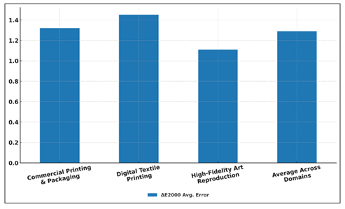 Figure 3 ΔE2000 Average Color Error Across Printing and Art Reproduction Domains The findings prove that the proposed structure has been constantly more successful than the classical ICC-based workflows in terms of color accuracy and operational efficiency. Figure 4