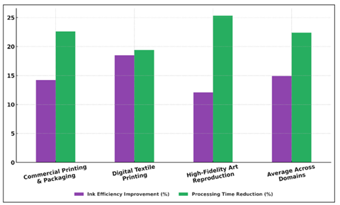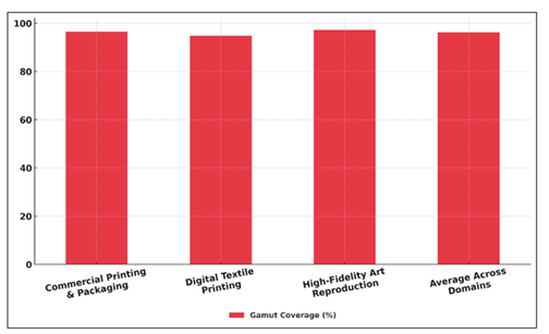 Figure 4 Domain-Wise Analysis of Ink Savings and Production Time Reduction Figure 4 presents savings on ink and time saved on production investigated on printing areas. Mean 2000 error of all domains is very small (1.29) so the perceptual accuracy is very high. High-fidelity art reproduction with the smallest error (ΔE = 1.11) is obtained because of the controlled printing environment and the possibility of the system to learn finer spatial-chromatic variations. Figure 5 indicates relative gamut coverage in the printing and reproduction of high-fidelity art fields. Figure 5