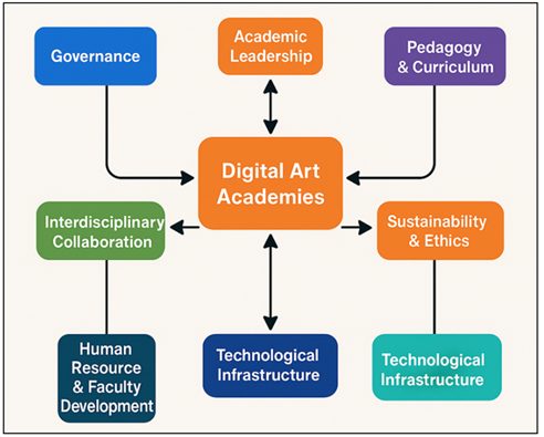 1. INTRODUCTION The twenty first century has seen the radical change in the art and design education horizon. The physical studio, atelier, and mentor-apprentice pedagogical model of traditional art academies, are now finding their way through the m azes of digital transformation. The introduction of digital art schools is not just a technological improvement, it is a reorganization of organizational culture, management practices and paradigms of learning within creative institutions. With the intersection of artificial intelligence (AI), virtual reality (VR), augmented reality (AR), blockchain, and cloud technologies with creative processes, the creative education management requires a new leadership approach, resource distribution, and pedagogical practice. Such a combination of technology and creativity demands an overhaul of how administrators operate institutions, how academic institutions develop and organize academies, and models of operations and organization to back up hybrid, remote, and digitally networked art education ecosystems Guillén-Gámez et al. (2024). The established management patterns of art institutions that are based on the linear hierarchies and discipline-based departments, fail to embrace the flexible, inter disciplinary and collaborative aspects of current practices in the creative industry. By contrast, digital art schools focus on agility, inclusivity, and innovation and support the learning process through projects, and active collaboration between artists, technologists, and educationists. This transition requires not only the new technologies but also the change of governance framework and finding a balance between creative autonomy and the data-driven decision-making process. An example is that AI-enabled learning management systems (LMS) will be able to observe the behavior of the learners, monitor creative development, and tailor the learning routes, which will allow the creation of a more flexible and student-centered environment Nieminen et al. (2023). In the same sense, democratization of the creative pipelines and digital repositories through clouds, allows equitable participation among the global creative networks by providing equal access to tools, assets and learning materials. In terms of management, the digital art academies are complex ecosystems that encompass pedagogy and technology and the organizational strategy. The management models should mention the interdependence of operational efficiency and academic innovation. They need to be in conformity to the fast-changing digital media tools and maintain the principles of experimental art and preservation of culture. The governance of the digital academies, thus, should be decentralized and adaptable in order to allow collaboration between departments and be constantly innovative. Figure 1