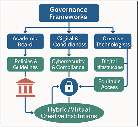 3. Organizational Structures for Digital Art Academies 3.1. Governance frameworks for hybrid/virtual creative institutions The creative institutions of the future (hybrid and virtual institutions) will demand a shift in governance between traditional management in a hierarchical structure to distributed, participatory, and data-driven structures. In contrast to the traditional academy that operates within the physical studio and departmental silos, the academic of digital art functions within the digital ecosystems- physical, virtual and hybrid environments are combined. Their rule should thus be transparent, agile and inclusive without involving academic rigor and artistic freedom Zhen et al. (2021). In addition to decentralized decision-making, it is important to note that modern frameworks do not exclude collaboration between academic boards, digital coordinators, and creative technologists, which occurs through cloud-based platforms and collaborative dashboards. In Figure 2, a structured model is presented, which brings policies, stakeholders, workflows, and digital governance mechanisms to the point of convergence. Figure 2