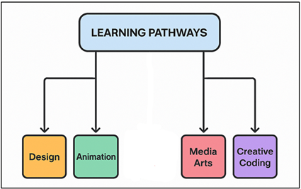 Figure 3 Learning Pathways in Digital Art Academies Design pathways are concerned with problem-solving oriented on human beings, the principles of UI/UX, and visual communication. Animation lines are more focused on the storytelling, character design, and the methods of procedural generation. Figure 3 depicts increasing skills as a result of design, integration of media and technology. Media arts integrate interactive installations, sound design and digital performativity, whereas creative coding develops the use of algorithms in generating creative work using programming languages such as Processing, p5.js and Unity. The joint capstone projects have the effect of integrating students in various tracks so as to create a simulation of production pipelines in the real world. The inclusion in the industry tools, software certification, and professional mentorship also make sure that it is relevant to the changing needs of the market. With the adoption of versatile courses that are enabled by online platforms, academies enable learners to build their own unique experiences, which can be both specialized and creatively diverse. The model will equip graduates with hybrid work in the areas of design, technology, and media innovation, which validates the transdisciplinary spirit of contemporary digital art education. 4.3. Integration of AI, VR/AR, and Multimodal Tools in Pedagogy The combination of AI, VR/AR, and multimodal tools with pedagogy transforms the learning experience in the digital art academies, through integration of immersive technology with creative thinking. AI-based applications promote adaptive learning infrastructures to customize content delivery, automatize routine evaluations, and also to render smart feedbacks on creative projects. As an illustration, generative AI may be used to help with ideation, proposing composition variations or color combinations, whereas machine learning algorithms could be used to critique and be inspired by the artistic styles. The virtual and augmented reality changes classrooms into experiential learning environments. Learners are able to build installations, create digital exhibitions, or learn about historical forms of art in physical and virtual models, blurring physical and virtual art forms. Remote collaboration is also possible in VR studios, through which learners around the world can collaborate in common 3D environments. Multimodal learning systems are integrated systems of text, image, sound, gesture, and code, which facilitates students to think and make across the senses. These platforms are used by the educators to build interactive lessons, with the use of gesture recognition, spatial audio, and real-time rendering. 5. Technological Infrastructure and Resource Management 5.1. Digital learning platforms and LMS architectures Digital art academies rely on digital learning systems based on learning management system (LMS) architecture and digital learning platforms. These systems facilitate the smooth provision of creative content, evaluation, and collaboration in the hybrid or completely online contexts. A powerful LMS incorporates the multimedia content management systems, peer reviews and adaptive learning analytics to monitor creative success and participation. Other platforms like Moodle, Canvas, and Blackboard are also being more personalized with an AI-backed module that makes learning more personalized and office management like grading, attendance, and feedback more automated. In the case of art and design education, LMS architectures should provide an opportunity to upload high-resolution media, interactive portfolios, and real-time feedback. Connections with digital asset management systems (DAMS) guarantee the safety of storing creative projects and controlling its version evolution. Besides, it can be integrated directly into a workflow by connecting with design products (Adobe Creative Cloud, Blender, Unity, or Unreal Engine). The scalability and accessibility of the open-source and cloud-based LMS solutions contribute to the global collaboration between students and educators. Developed analytics devices display performance trends, allowing the instructors to personalize interventions and enhance the learning results. Therefore, a properly designed digital learning ecosystem alters the management of academics by turning it into a dynamic, data-driven, and student-oriented creative environment, as well as allowing learners and educators to engage in creative activities, innovate, and effectively manage creative knowledge. 5.2. Cloud-Based Creative Pipelines and Asset Repositories Creative pipelines built in the cloud transform the functioning and community aspects of the digital art academies by making it possible to access creative resources, tools, and computing capacities in real-time. These pipelines simplify the geographically distributed creative process of concept ideation and modeling, rendering, and distributing between the end-to-end creative process in geographically separated teams. With the help of such tools as Google Cloud, AWS Educate or Microsoft Azure for Education, the institutions can roll out scaled infrastructure to support high workloads in animation, visual effects, and digital fabrication. A vital section of such pipelines are asset repositories. They offer a hierarchical storage and version management of multimedia content, 3D content, project documents and interactive prototypes. The ability to co-create using metadata tagging, version tracking and collaborative editing tools, along with creative integrity and data security make students and faculty efficient in creating works together. Interconnection to content delivery networks (CDNs) also makes use of optimum access speed, and API supports interoperability between creative software ecosystems. Cost-efficient rendering and simulation is also enabled by cloud computing and is no longer constrained by the local hardware. Digital art schools c