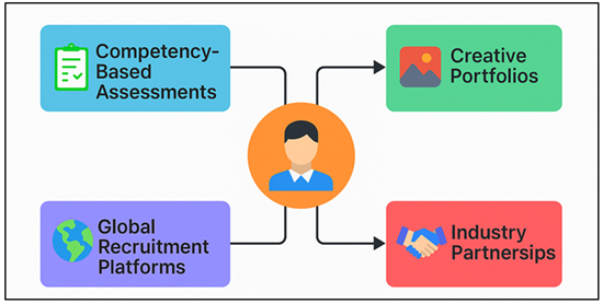 Figure 4 Recruitment Strategies Framework for Digital-Native Creative Educators Some of the key principles related to recruitment are equity, inclusivity, and cultural diversity. Adaptive hiring, training and collaboration models of creative educator are presented in Figure 4. The advantage of digital academies is that the faculty members are equipped with interdisciplinary views and cross-cultural information to apply in the classroom. The model of flexible appointments, such as adjunct, visiting, and remote faculty appointments, also adds more variety to the institutional ecosystem. Finally, good recruitment methods lay stress on educators who are innovators, technologists and mentors- those who can coach the learners in the cross-roads of art, technology as well as critical thinking in an ever-changing digital creative environment. 6.2. Continuous Upskilling Through AI-Driven Training Modules The faculty designing in the digital art schools should be a continuous, dynamic process in line with the advancement of technology. The training modules developed by AI are an intelligent solution to constant upskilling through a skill analysis of educators with a personalized learning trajectory based on the recommendations and an automated performance monitoring system. The modules use data analytics and adaptive learning algorithms to personalize micro courses around new tools, including generative AI, immersive storytelling, machine learning in creative design, and digital asset management. The faculty members can use AI-based learning platforms with interactive tutorials, simulations, and peer cooperation. The systems have the ability to dynamically change the complexity of their contents depending on the progress and performance of the users, making them efficient and engaging. As well, virtual sandboxes enable instructors to test out new technologies, such as neural rendering or multimodal AI, without interfering with the process of teaching. The role of institutional management is important as it can incorporate AI-powered upskilling initiatives into the faculty appraisal framework and connect the professional development to quantifiable results. Reward systems, online certificates, and online learning come together to enhance reward and encouragement. These AI modules are based on the ethical AI use, creative adaptability, and digital pedagogy, in addition to the technical capability. The ongoing and evidence-based upskilling is converting faculty into a life long learners and instructor, making sure the digital art academies are pedagogically relevant, technologically oriented and competitive in the realm of creative education across the world. 7. Conclusion The development of digital art schools is a radically new re-definition of creative education: it is the one that incorporates aesthetic creativity with technological smartness, ethical management and sustainability. The management practices involved in the management of these institutions should however go beyond the conventional administrative models that balance creativity and digital transformation with resilience of institutions. It is apparent that all this study that there is a need to strike a balance between innovation and structure in managing a digital art academy to create systems that are flexible, inclusive, and accountable at the same time. The key aspects that governance in a hybrid and virtual environment has to focus on are decentralization, transparency, and agility, and leadership in academics should show interdisciplinary vision and be digitally savvy. Competency-based learning and multimodal engagement pedagogical frameworks can be used to make sure that students learn not only the technical skills but also develop critical and cultural insight. The technological infrastructure, comprising of LMS architecture, VR/AR laboratories and cloud pipelines, lies at the backbone of the operative frameworks, which allow enabling real-time collaboration, scaled operation and sustainability. No less important is the human aspect which includes hiring digital-native teachers, encouraging unceasing professional growth based on AI and collaboration with industry professionals all of which enable institutional change.