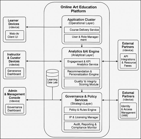 1. INTRODUCTION The global educational environment has been transformed by the rapid growth of digital learning environments and art education is not an exception. The online art education platform management has become an important strategic field, which brings pedagogy, technology and creative economics together. Such platforms as institutional learning management systems (LMS) to separate creative marketplaces are vital facilitators of democratising the access to artistic knowledge, acquiring skills and collaborative creativity Pavlou (2022). Over the past few years, high bandwidth connectivity combined with relatively cheap digital devices and the use of artificial intelligence (AI) has changed the way art is taught, critiqued, and monetized. Nevertheless, the operation and maintenance of such platforms are complicated issues, which are associated with pedagogy, governance, intellectual property, and efficiency of operation Sabol (2022). The process of online art education development has been triggered by the increasing need to engage in flexible methods of learning and the international transition of consuming content online Somekh (2007). Contrary to the classroom education with a traditional framework, online art platforms have to support not only a cognitive learning process but also influence other dimensions of the affective and psychomotor engagement essential in creative fields. The necessity of simulating the experience of working in a tactile studio, providing the real-time feedback on the visual work, and ensuring the collaboration with peers introduces complexities in the management, the ones that are not characteristic of other areas of e-learning. Moreover, when these platforms incorporate AI applications to critique images, recreate styles, and evaluate portfolios, the problem of ethical use and creative ownership is getting even more valuable Brumfield Montero (2021), Quinn (2011). Figure 1