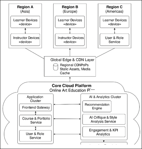 Figure 2 Governance and Operational Framework of Online Art Education Platform The intellectual property governance ensures the protection of the rights of creators by Creative Commons license, provenance, and ethical management of AI-assisted art pieces and culturally sensitive content. To supplement such dimensions, strong data governance would make sure that privacy provisions, algorithmic transparency, and ethical controls would be adhered to avoid bias. Together these aspects are brought together in a governance architecture of stratum, operation and analytics that allows adaptive decision making, fair involvement and platform development in a balanced way of freedom of creation as well as institutional responsibility. 4. Proposed Backend Architecture and Cloud Resource Allocation The success and scalability of online educational platform in art is largely determined by the technological infrastructure and the manner in which digital resources are planned, distributed and optimized with time. Art-oriented platforms are required to store high-resolution images, layered design files, 3D assets, time-based media, and AI-load to recommend, transfer styles, and critique unlike traditional e-learning systems that mainly process text and video. Such a combination leads to unique storage, compute, latency and fault tolerance requirements. A well designed infrastructure will result in learners enjoying low-latency content delivery and responsive creative tools and instructors and administrators of the service enjoying reliable analytics, governance and monetization services as shown in Figure 3 below. The platform core is a multi-tier backend architecture that is typically implemented on a hybrid or public cloud. The presentation layer is used to support web and mobile interfaces, which rely on the content delivery networks (CDNs) to store the static files such as video segments, reference images, and tutorials near the users. The application layer contains microservices with the primary role to user administration, course synchronization, assignment submission, portfolio rendering, and notification functionalities. To manage demand peaks on live workshops or global launches, auto-scaling makes use of dynamically scaling of compute resources on the basis of CPU, memory and I/O factors. Figure 3