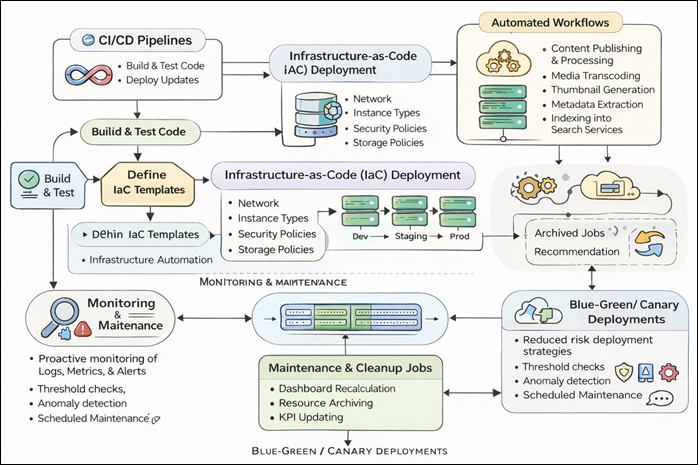 Figure 4 CI/CD-driven automation and maintenance architecture. Business-intelligence and analytics platforms (e.g. embedded dashboards or cloud-native analytics services) process the streams of the data lake to calculate key performance indicators (KPIs) of the learner engagement, course effectiveness, and the churn. Role based access: this is where learners will view personalized progress views, instructors will see cohort level performance, and administrators will see aggregate metrics to aid in strategic planning. Extensive integration with third party AI engines gives the creative toolset a wider range of possibilities. Readymade vision models can offer standard style recognition, composition recognition or object recognition, whereas tailored models are trained on evaluation sets of works of art, drawings, or design tasks. Behind internal APIs these AI services are encapsulated such that input formats are standardized, rate limited and inferences events are logged so that they can be audited. In case of legal or ethical reasons, the platform may host models on its resource base in order to not transmit sensitive or copyrighted works to the third-party providers. 6. Workflow Automation and Maintenance There is a need to have excessive workflow automatization in order to eliminate manual bottlenecks and minimize downtime in an online art education platform and operational excellence. The continuous integration and continuous deployment (CI/CD) pipelines continuously construct, check, and roll out the new features in a way that the changes in the creative tools or governance regulations spread uniformly across the services. The templates of infrastructure-as-code (IaC) are used to describe network setup, types of instances, security groups, and storage policies and create reproducible development, staging, and production environments. Content and assessment life cycles are also supported using automated workflows. As an example, pipelines can be activated in response to the publication of a new course by an instructor with the triggering of media transcoding jobs, the creation of thumbnails, the extraction of metadata, and indexing in search services. Background workers process assignments when submitted by learners to include virus scanning, format validation, pre-assessment by AI, and routing to instructors. Periodic jobs re-rank recommendations, store idle resources and refresh KPIs used in dashboards as represented in figure 5 above. Maintenance procedures are based on active monitoring of the system health in terms of logs, metrics and alerts. Anomaly-detection or threshold-based mechanisms help the administrators to know that there is a performance degradation, security anomalies, or misconfigured policies. Blue-green / canary deployment strategies minimize the occurrence of platform outages when performing significant updates, which is paramount in events with time constraints, e.g. live workshops, portfolio reviews, or certification tests. All of these automation and maintenance plans give a strong technological base, which can be used to bear the governance, pedagogical, and economic goals identified earlier. Figure 5